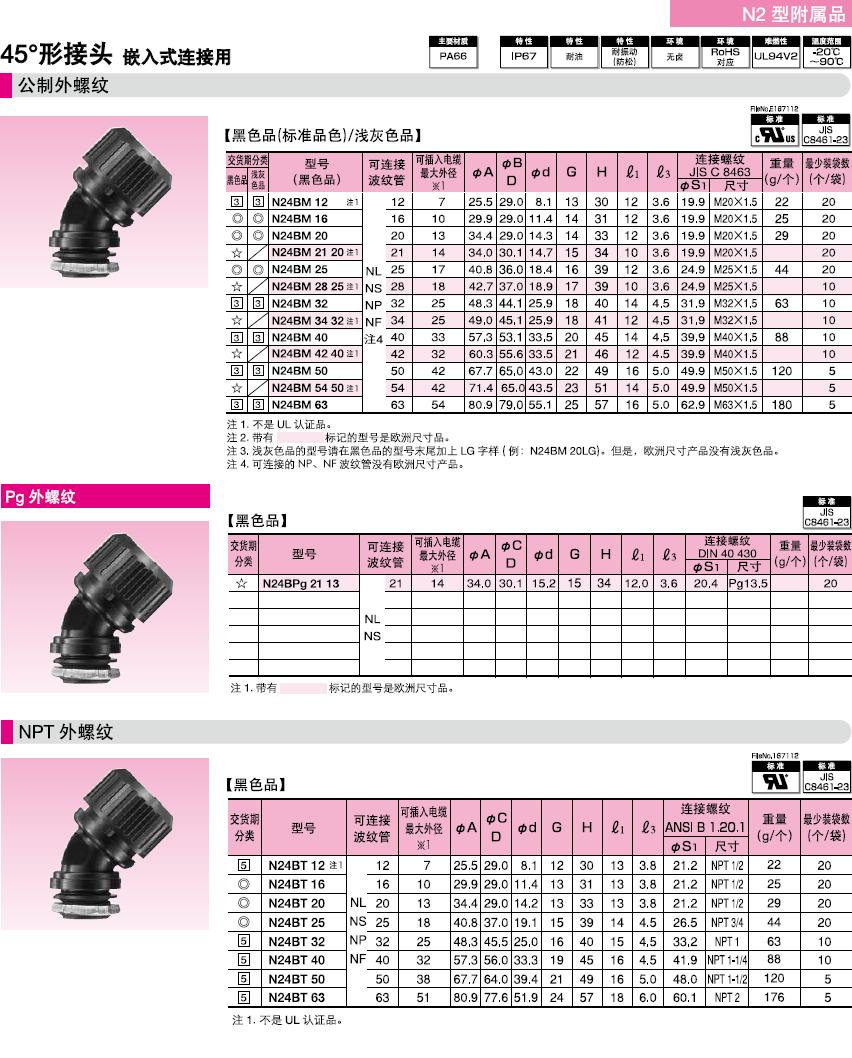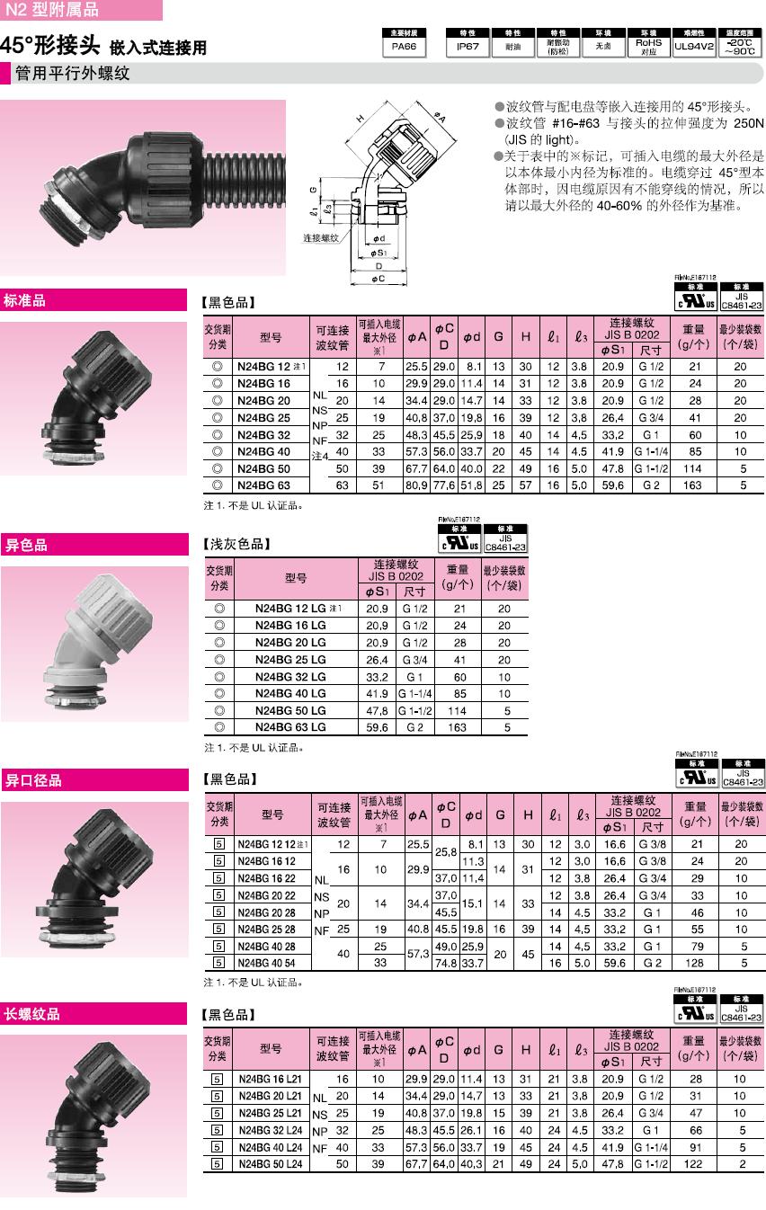 ·關于表中的※標記,可插入電纜的最大外徑是以本體最小內徑為標準的。電纜穿過45°型本體部時,因電纜原因有不能穿線的情況,所以請以最大外徑的40-60%的外徑作為基準。